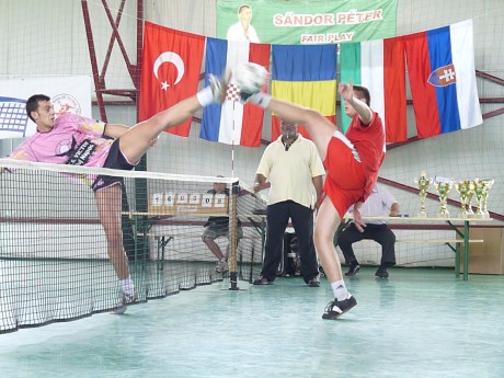 S pozorným sledovaním finálových súbojov smečiarov-blokárov na sieti - na snímke úspešný blok Alina Balaua (ROM) z víťaznej trojice Victory Cluj-Napoca (spoluhráči Florin Purice a Daniel Sasarman) proti smečujúcemu Dávidovi Jónásovi z Maďarska.